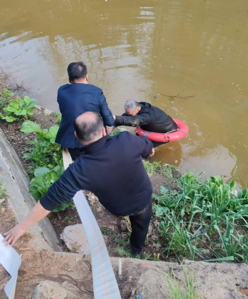 “ 水带!用消防水带拉他上来!”关键时刻,这一举措成为救援的转机。老人紧紧抓住水带,众人合力将他拉到堤边。救生圈、竹竿、水带——三样工具成了守护生命的“三道防线”。